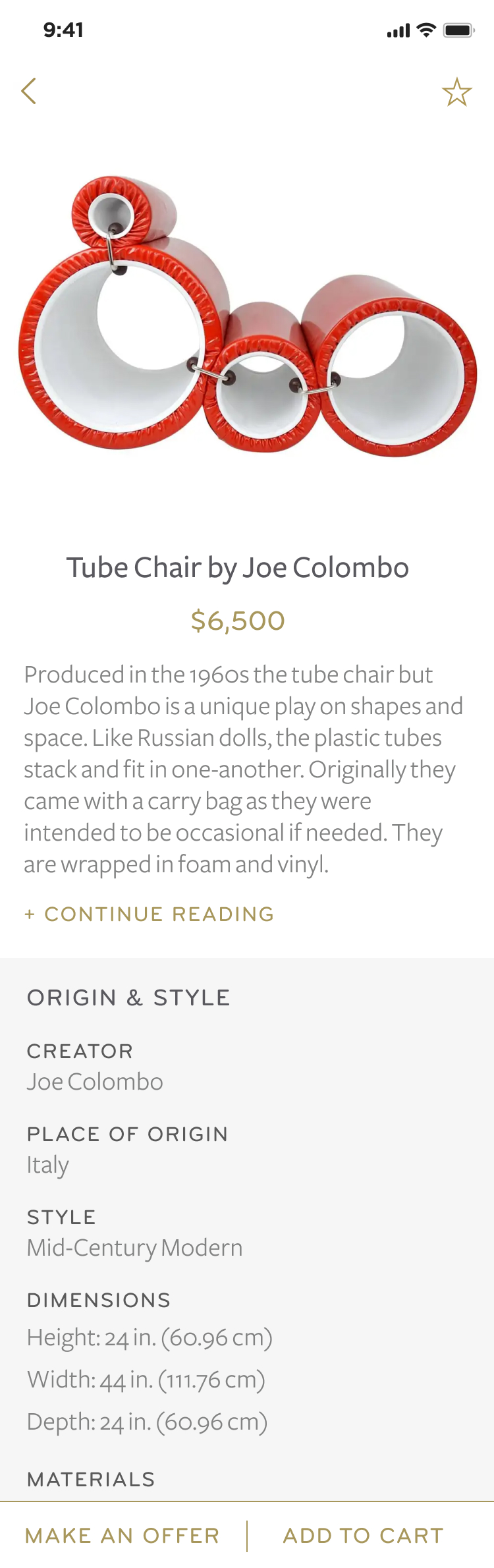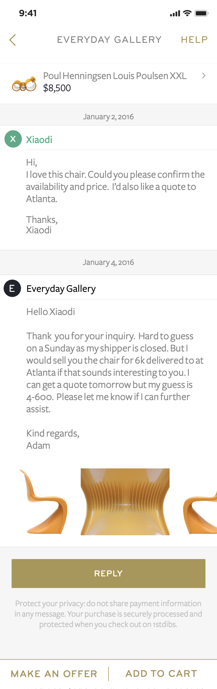 After the first release of the app, we continued to work with the product and technology team on new feature development. Over the course of the following year, we designed a message center that allows customers and dealers to communicate about a product,  ‘make an offer’ functionality for customers to negotiate the price of a product, the ability to follow dealers and galleries, and manage complex favorites in a folder system. As we continued to refine the consumer-facing user experience we began working on a dealer facing iOS app.