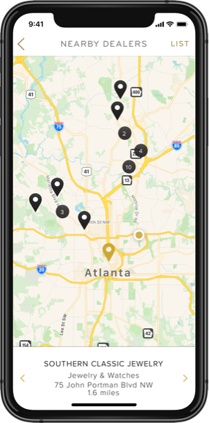 Working closely with the product team, we leveraged the deep catalog of items on 1stdibs to support modes of discovery and shopping with intent. Customers can search or browse by categories that interest them, or they can flip through curated collections for inspiration. They can save items, chat directly with dealers, and make a purchase seamlessly. We used the iPhone’s geolocation capabilities to support in-the-moment experiences. At any location, shoppers can find dealers and galleries near them.